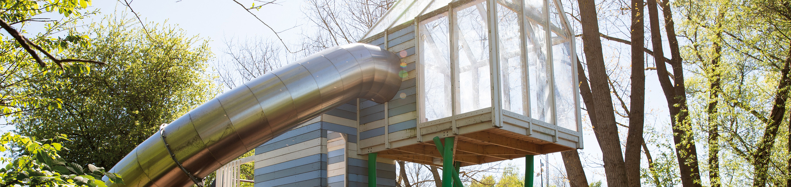 Få utlopp för din äventyrslusta genom att ta dig fram över klätternät, klätterkullar och rutschkanor. Lekplatsen är uppbyggd som en hinderbana och binds ihop via en slinga som man kan ta sig runt utan att nudda marken – om man så vill.