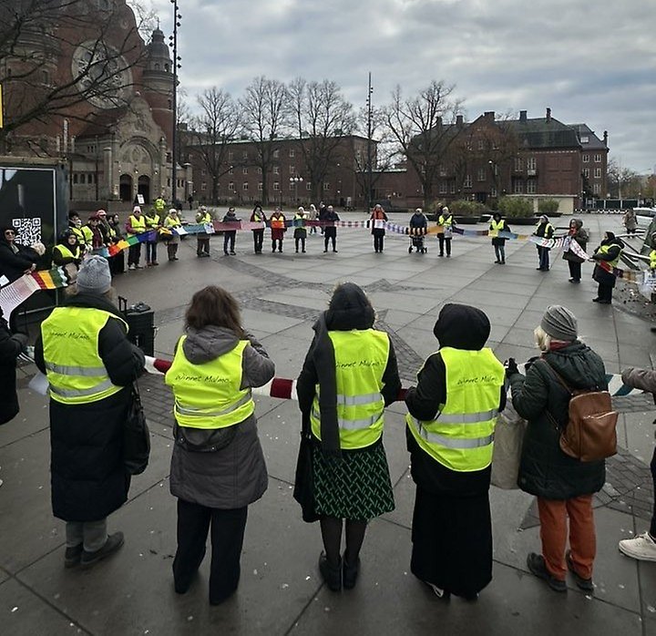I april 2021 dödades fem kvinnor i Sverige, då fick vi nog. I vår monter kan du se en 45 meter lång halsduk, en protesthandling mot mäns våld mot kvinnor, som stickats av ett stort antal kvinnor.