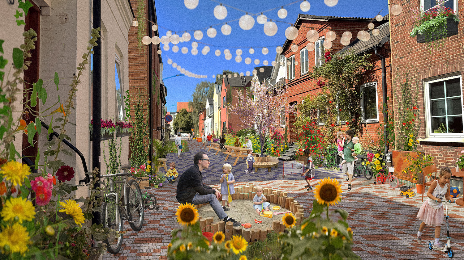 Hela stadsdelen ska vara enkel och trygg att röra sig i. Genomfartstrafik kan tas bort, bilar kör långsamt eller hålls utanför området, och grönska finns nära och tillgänglig. Lek är en naturlig del av vardagsmiljön, inte bara något som sker på inhägnade lekplatser.