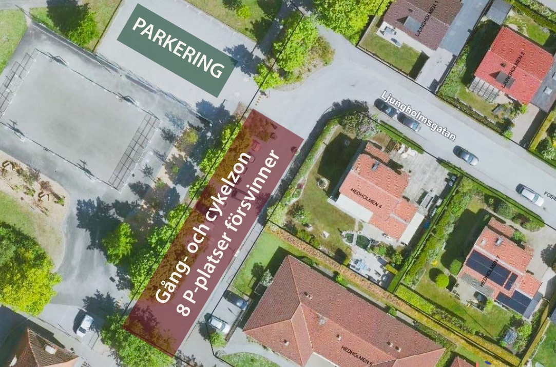 Efter utvärdering och fortsatt dialog med skolan beslutades att ytterligare åtgärder kan göra trafiksituationen ännu bättre. Därför tillkommer fler förändringar under våren 2026. Parkeringsytan just utanför skolan (se bild nedan) tas bort och ersätts med cykelparkeringar och grönska. Leveranser eller annan nyttotrafik till skolan kommer fortsatt tillåtas denna väg.
