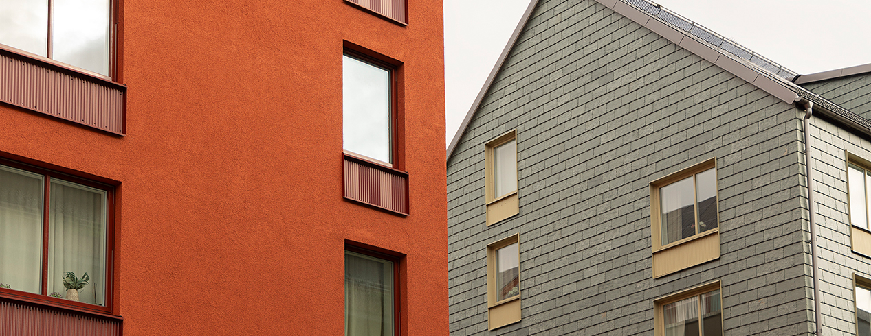 Journalen består av fyra huskroppar med fasader i röd puts och grönt skiffer. Foto: Jens Nordström