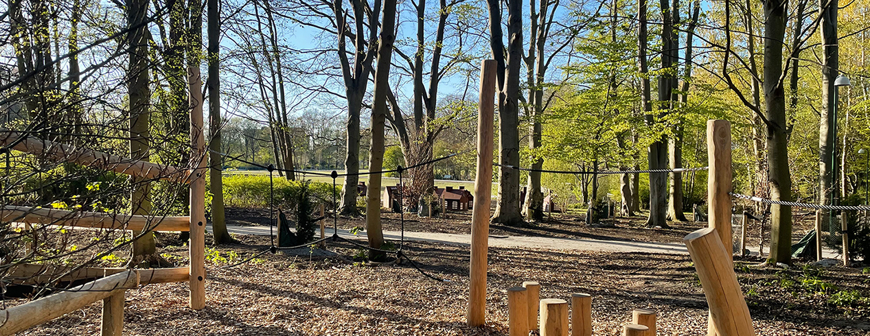 Den nya temalekplatsen ligger intill bokridån och bjuder in till lek både på den öppna ytan och inne bland träden. Lekplatsen har en naturnära utformning med mjuk träflis, klätterställning i trä utformade som kastanjer och ekollon samt ett högt torn där man kan blicka ut över trädkronor och fågelholkar. I skogsbrynet, bland de stora träden, finns inte bara en stor trädkoja utan även en labyrint av rishäckar och en utmanande hinderbana.