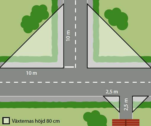 Sikten vid in- och utfarter ska vara fri minst 2,5 meter från gatan eller gångbanan. Vid hörntomt gäller 10 meter fri sikt från hörnet räknat, oavsett om tomten ligger vid en gata, gång- eller cykelväg, (Se bild, Sikttrianglar). Vid övergångsställen och cykelöverfarter ska sikten vara fri minst 10 meter. Vid hastigheter över 30km/h ska måttet ökas och anpassas efter befintlig hastighetsbegränsning.