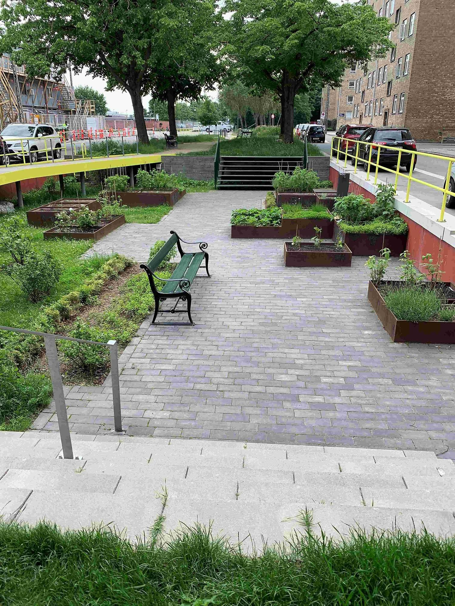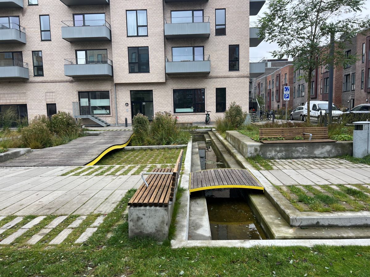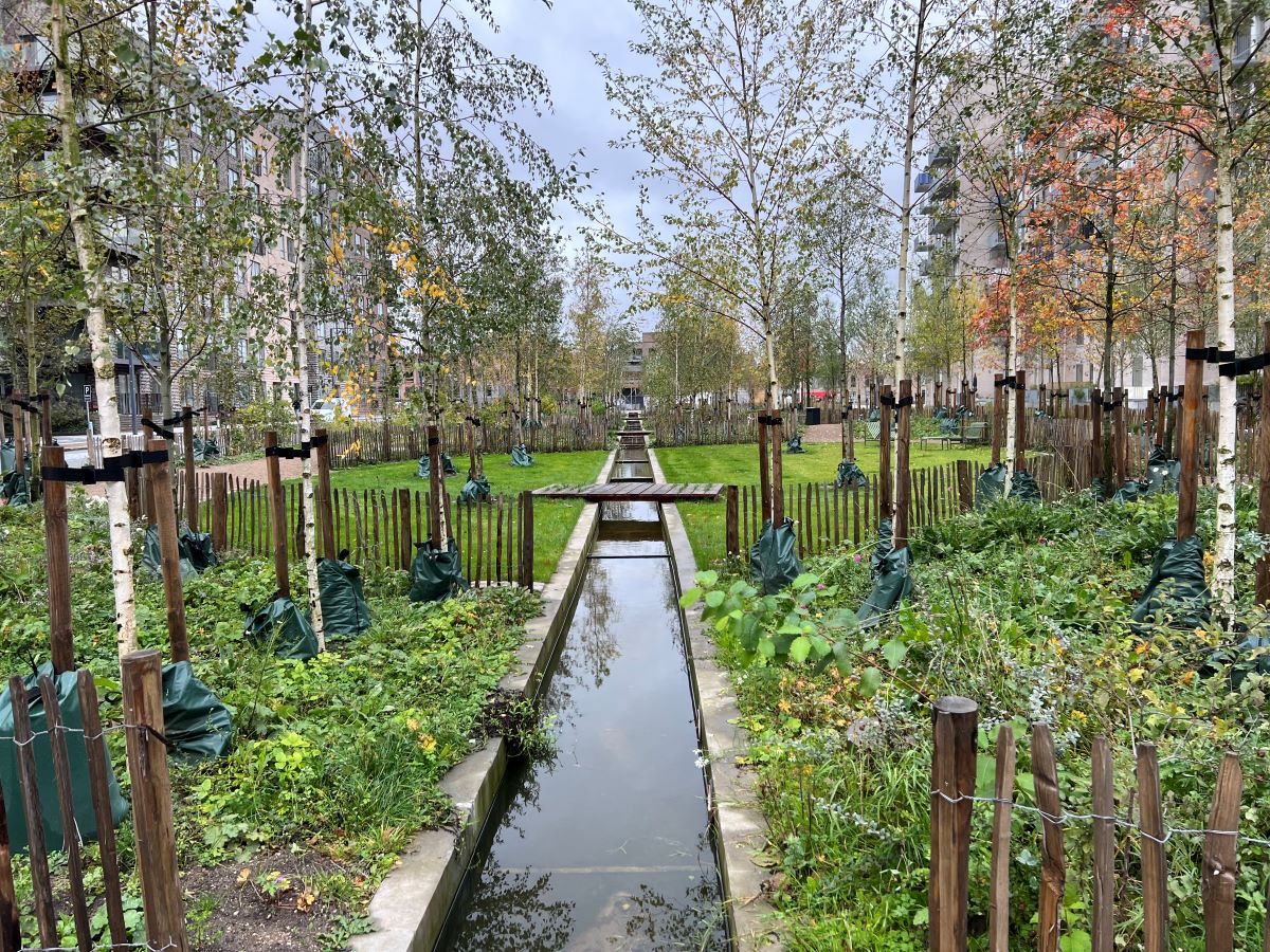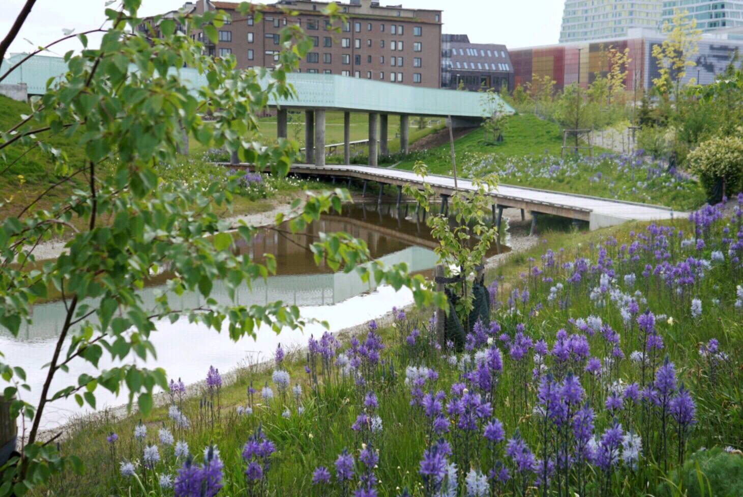 Bilder på ränna för hantering av dagvatten med omkringliggande ytor för hantering av skyfall i södra Örestad och vegetationsytor med makadammagasin på Möllevången.