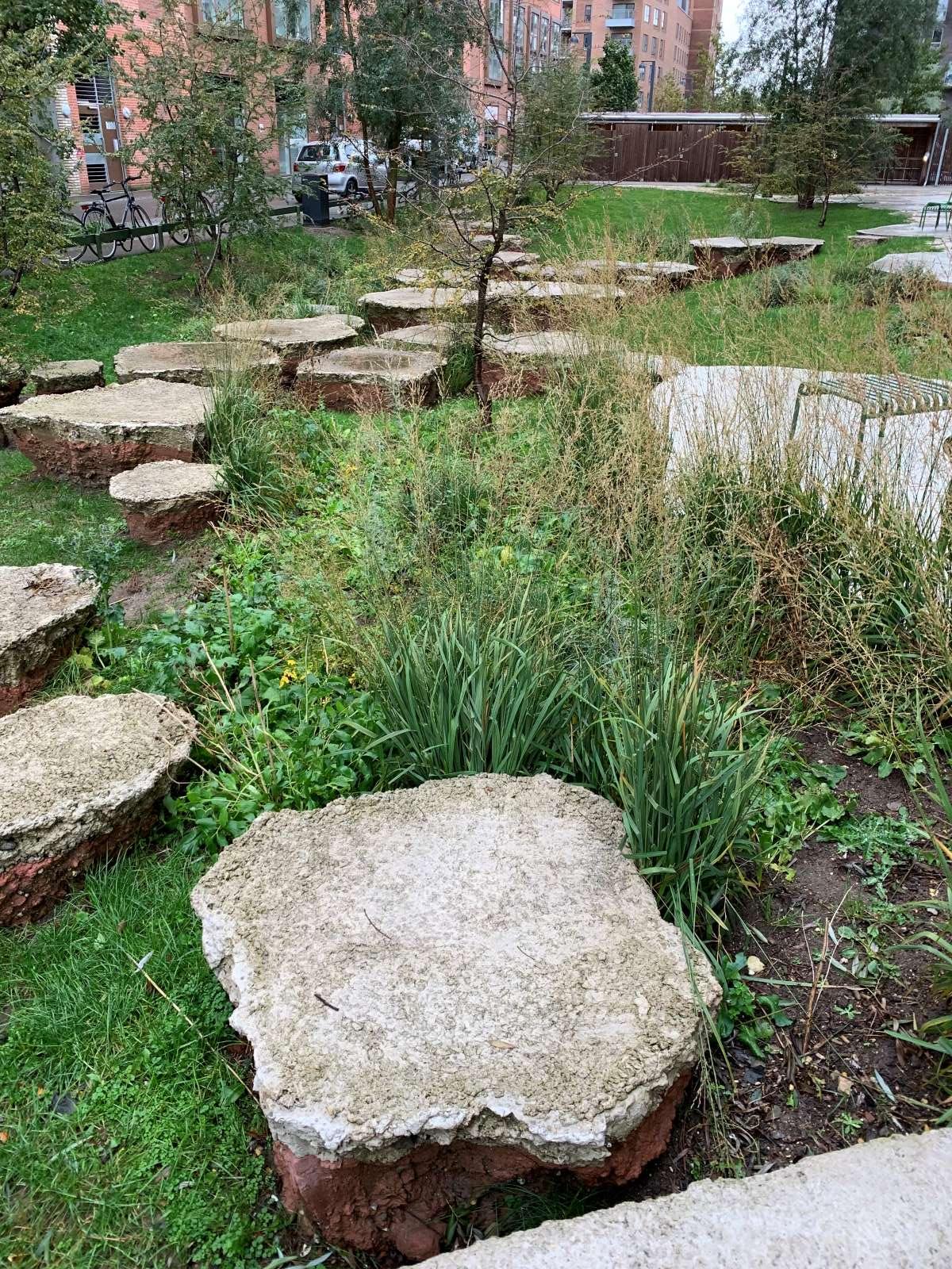 Inspirationsbilder på storskaliga lösningar dimensionerade för att kunna samla upp och fördröja stora volymer vatten.