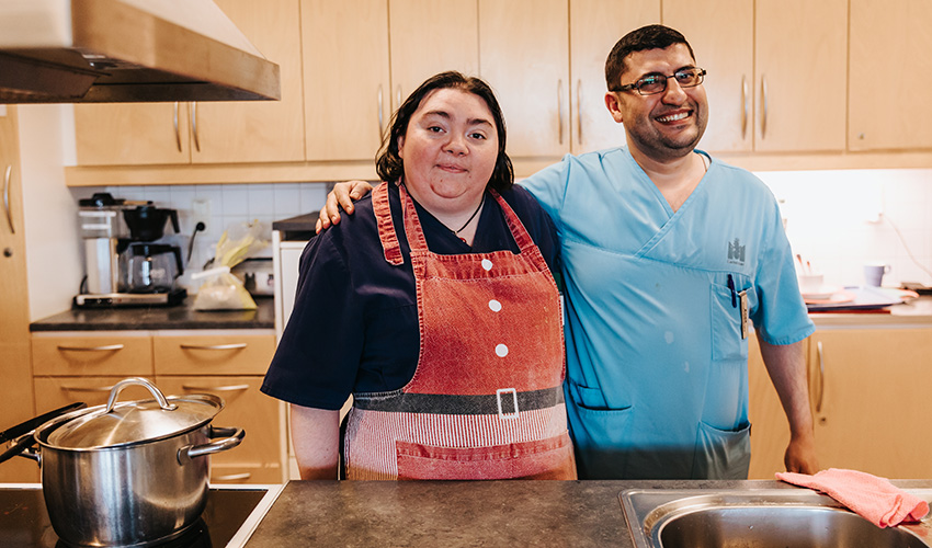 Köksbiträdet Martina Madsenser till att dofterna sprider sig från köket, understödd av undersköterskan Anas Obaid.