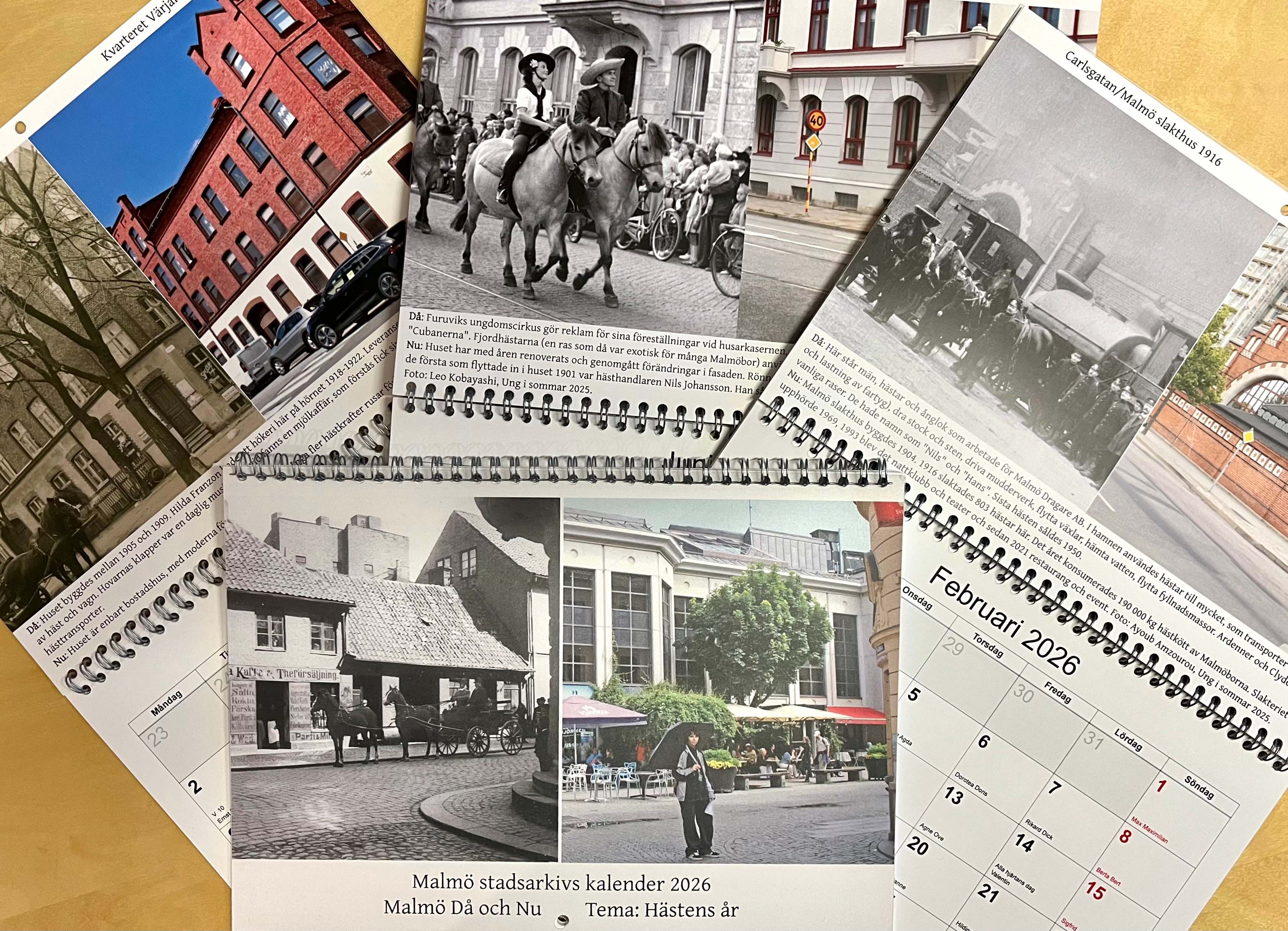 Malmö stadsarkivs årskalender 2026 består av tolv uppslag. Bilderna i kalendern fångar Malmö ur historiska och nutida perspektiv. Årets tema är Hästens år, där de äldre bilderna på olika sätt skildrar hur hästen haft en roll i Malmös historia.