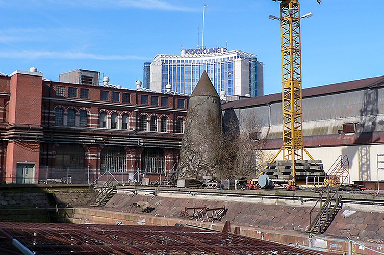 Inne i ett hörn på de äldsta delarna av Kockums gamla varvsområde finns ett märkligt bygge. Där står den nästan som en rymdraket som landat lite fel. En snart 100-årig spetsig bunker, numera övervuxen av vildvin.