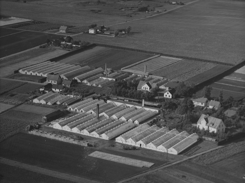 Flygbild över Ivan Landerup, trädgårdsmästeri i Kvarnby, ca 1940–50.