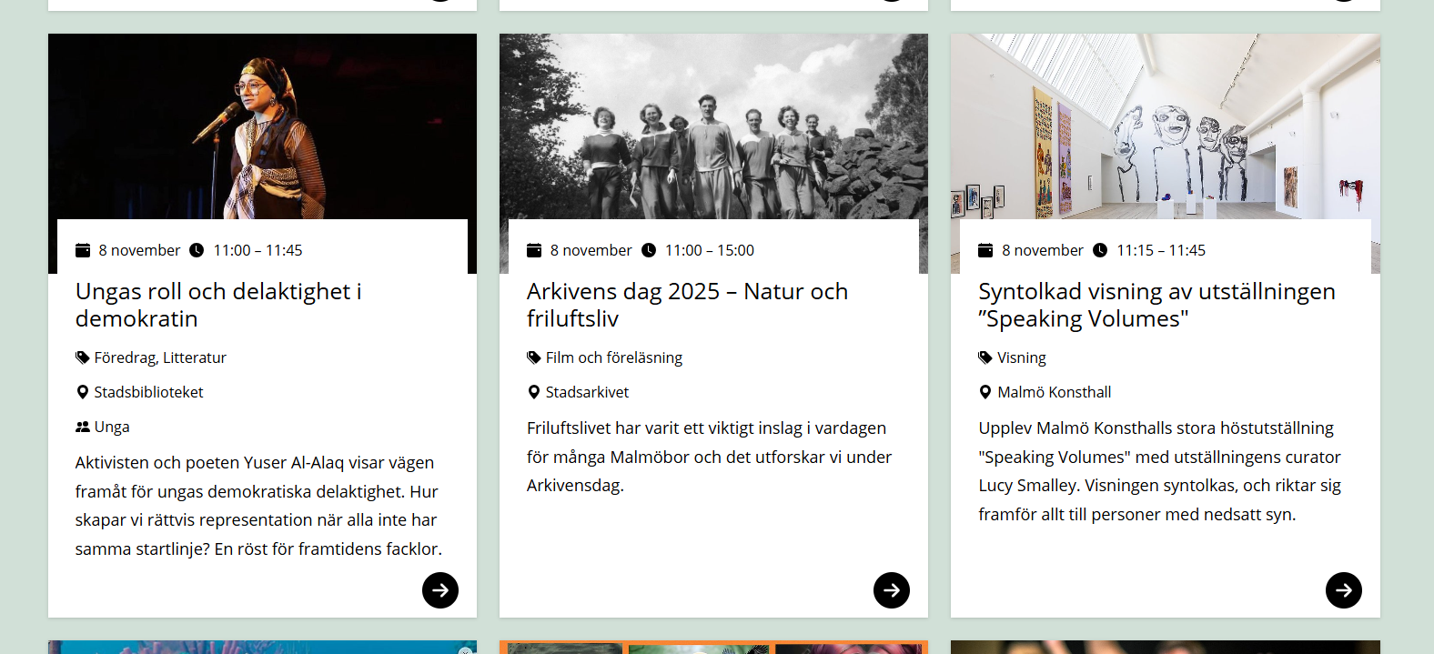 Ett evenemang med en pil-ikon i nedre högra hörnet av puffen länkar vidare till en sida på malmo.se där du kan läsa mer information om evenemanget.