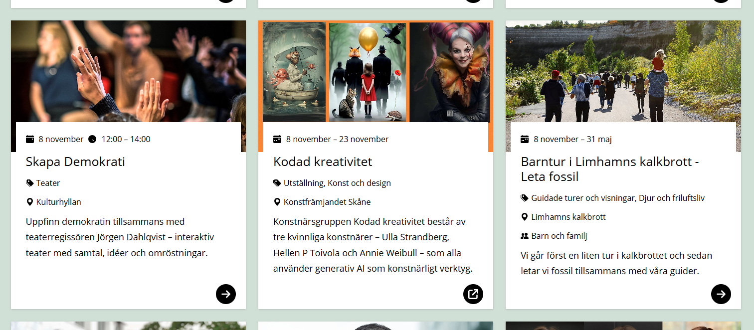 Ett exempel på hur det ser ut när ett evenemang, "Kodad kreativitet" i mitten av raden, länkar vidare till en sida utanför malmo.se: