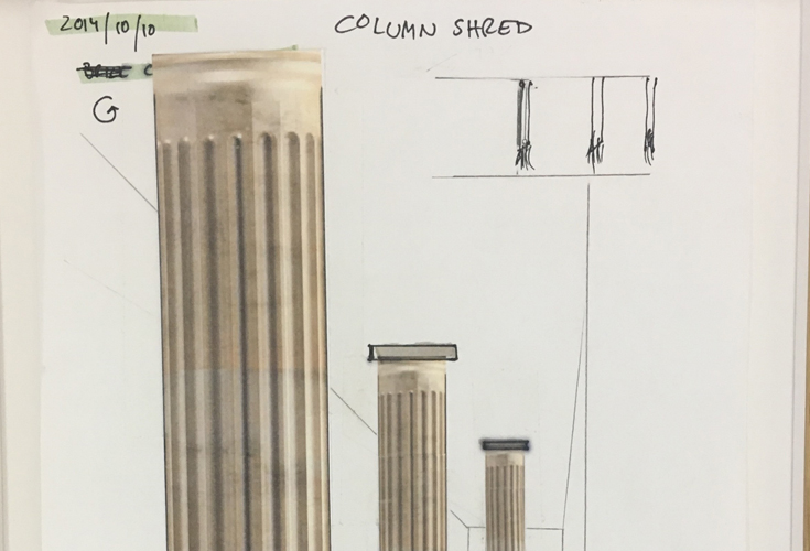 Column Shredkan i viss mån sägas illustrera en förutsägbar dåtid, samtid och framtid. Strukturen (som leker med tanken på att den är en bärande struktur, då den avbildar kolonner) som löper mellan tak och golv är helt redovisande: Från en rulle längst upp matas ett dokument ned, som verkar förstöras när det når marken. Rummets mått avgör alltså dokumentets (strukturens) förlopp. Vi kan alltså anta, förutse, att de kolonner vi fortsätter rulla ut kommer fortsätta löpa mellan tak och golv och de kommer fortsätta förstöras utanför detta mått. Ett sätt att ändra på förloppet vore att ändra på strukturen vi matar ut, en annan att förändra rummet vi placerar dessa i. I vilket fall tvingar det oss att se förbi en rad förutfattade begränsningar och i stället föreställa oss helt nya gränser.