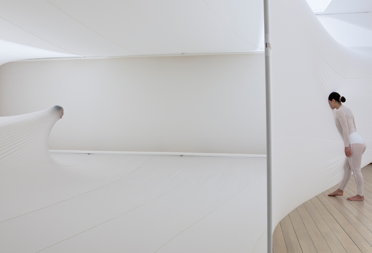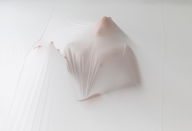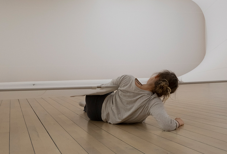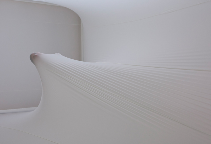 Den tydligaste inspirationen kommer ur den egna arbetsprocessen. Jag har länge arbetat med relationen mellan kropp och arkitektur och strävat efter en sammansmältning mellan de rigida arkitektoniska formerna och de organiska kroppsliga formerna. I tidigare verk har kropparna suttit fast i långsträckta elastiska membran. Som en vidareutveckling ville jag skapa volymer med statiska spänningsförhållanden, som kan ”stå” utan kropp. Samtidigt ville jag frigöra kroppen för att se vilka rörelser som blir intressanta att arbeta med då. Jag ser på de elastiska membranen som ett andra hudlager och strukturen i sig som ett bländande vitt, utopiskt rum med kontinuerlig potential att omformas. Inspirationen kommer i stora drag ur den tid vi lever. Hur känns det att vara kropp i vår tid?
