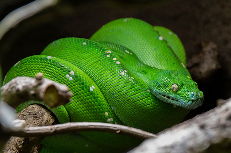 Grön trädpyton hittar du på avdelningen Djurens fantastiska funktioner på Akvariet.