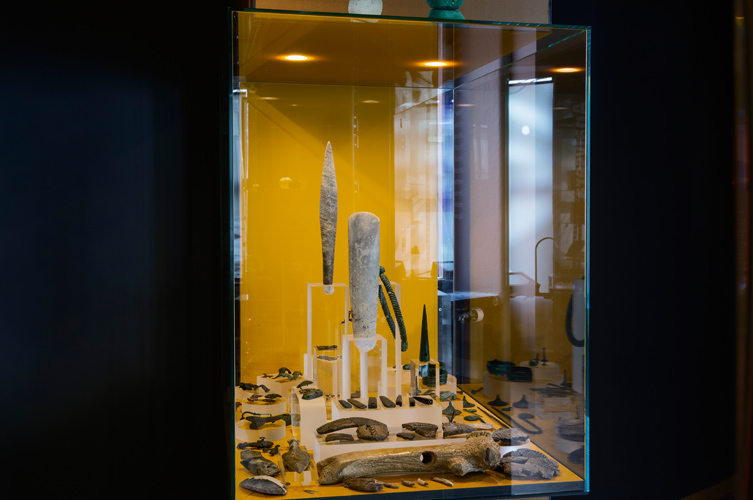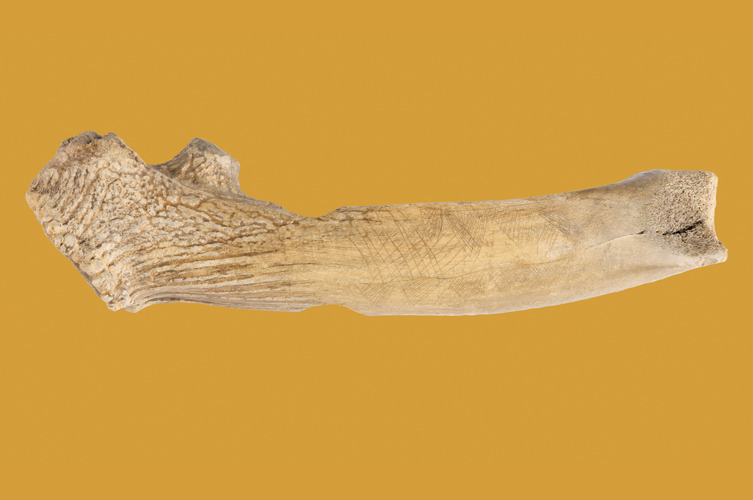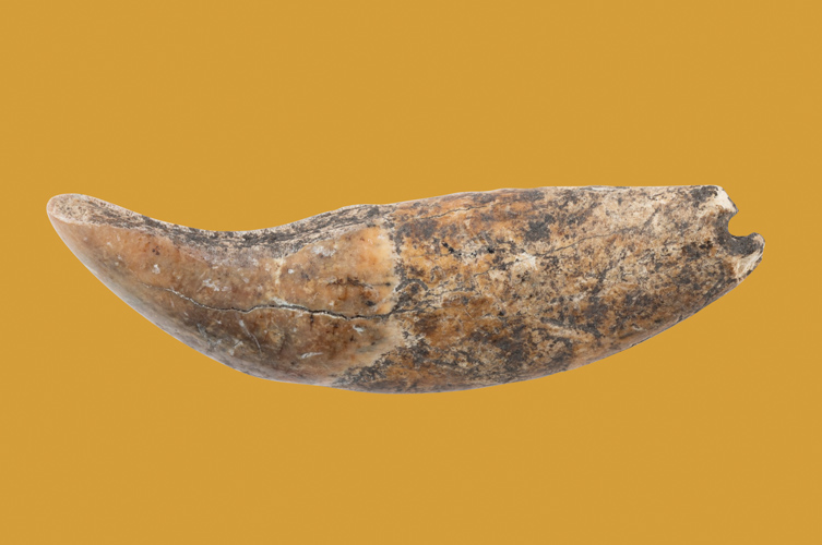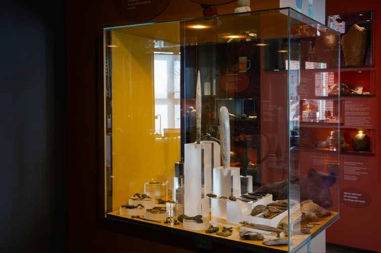 Under äldre stenåldern ristade någon in mönster på den stora hornhackan hittad i Segebro. Den är tillverkad av ett fällhorn från kronhjort. I förgrunden ligger hängen av djurtänder. De kan ha använts som amuletter eller längs en klädfåll. De är alla upphittade på samma plats. En dolk av flinta kunde bli en riktig statuspryl, om den tillverkades så att den liknade en dolk av brons. En sådan ligger med spetsen hitåt till vänster.