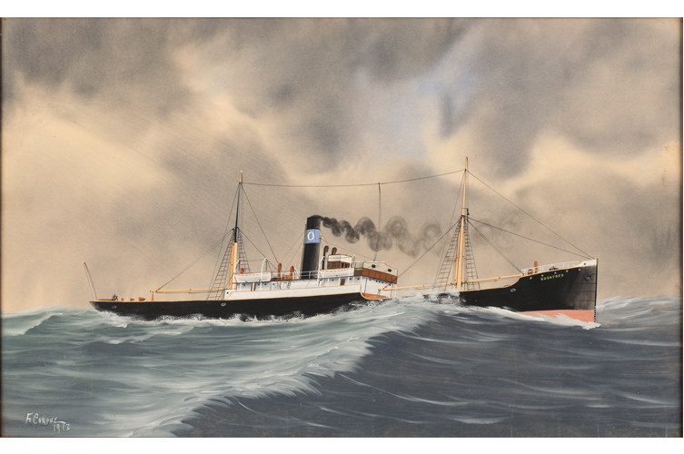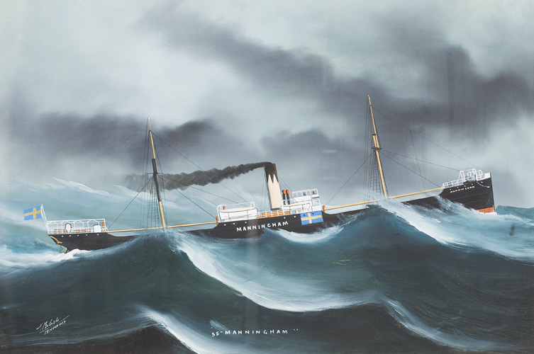 - Gouache, målningen utförd Italien 1915 av okänd konstnär. Motiv: Ångaren Manningham i stormigt hav.