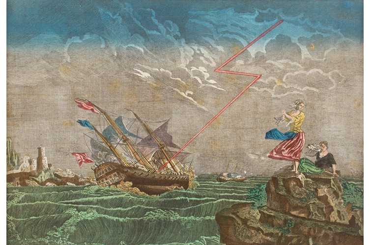 Motiv: Korvetten Saga i storm. - Gravyr efter teckning utförd av en officer som deltog i flottan då ett fartyg förliste efter ett blixtnedslag. Händelsen utspelade sig i Saint Lawrencefloden, Kanada, 1780.