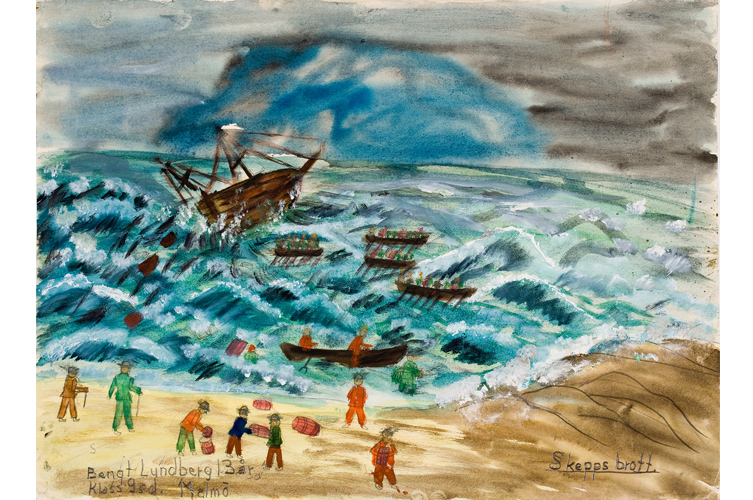 Motiv: Skeppsbrott. Teckningen är en av de barnteckningar som deltagit i Folket i Bilds teckningstävling 1951 och som sedan ställdes ut på Malmö Museer. - Gravyr 1680 av Kopparstickare Johan Huusman (-1711).