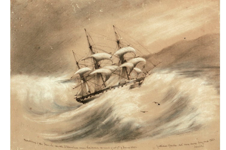 Motiv: Korvetten Alcmène strandar vid Kaipara på Nya Zeelands västkust den 3 juni 1851.