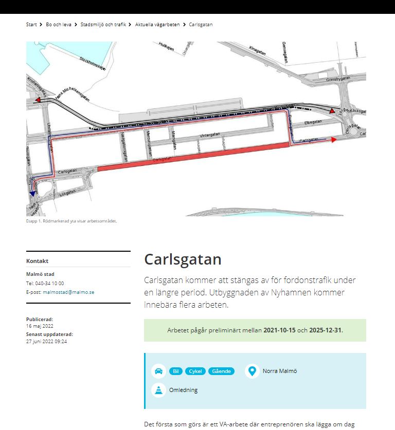 Vi ser att samma information återkommer när vi är inne på ett enskilt objekt (eller en enskild sida) i katalogen Aktuella vägarbeten, i det här fallet projektet Carlsgatan. I den gröna boxen lyfts datumen tydligt fram, eftersom att det är särskilt intressant i just sammanhanget vägarbeten, och värdena hämtas ifrån de fält som även syns på puffen för Carlsgatan på katalogstartsidan.