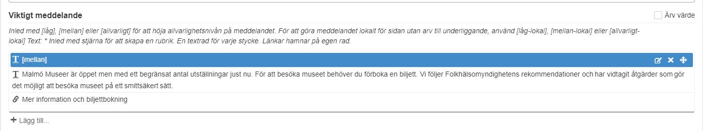 Här kan du skapa meddelanden som syns överst, eller i övre delen, på sidor för att tydligt kommunicera något särskilt. Under pandemin har det t ex använts mycket för att tydligt informera om vilka öppettider eller restriktioner som gällt på olika platser och institutioner.